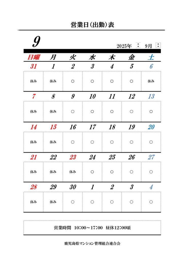 2025年9月 営業日のお知らせ 2025 9/20 お知らせ 2025年9月20日 お知らせ よかったらシェアしてね! URLをコピーしました! URLをコピーしました! かわらばん60号 秋のマンション管理セミナー 開催予定 関連記事 秋のマンション管理セミナー 開催予定 2025年9月20日 鹿管連「会員交流会」を開催 2025年3月6日 鹿管連会員交流会 2025年1月9日 マンションの台風対策 2024年8月27日 泡風呂(高発泡入浴剤)を使用により トイレから多量の泡が吹き出す事案 2022年12月28日 20221018「クローズアップ現代」放送 2022年10月19日 「No.1220 2022 7-28 日経アーキテクチュア」紹介します 2022年8月1日